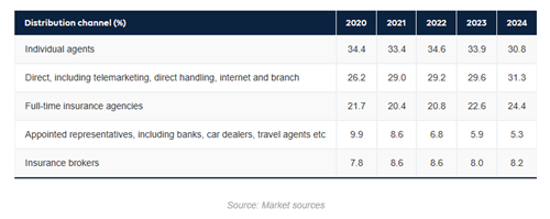 Distribution Channels: While the NAFR does not publish distribution channel data, the report includes a breakdown for PICC Property for the last five years that may serve as a proxy for the market as a whole. According to these numbers, the largest distribution channel for non-life in 2024 was direct (including telemarketing, direct handling, internet, and branch) with 31.3% of business. Individual agents oversaw 30.8%, full-time insurance agencies made up 24.4% with the rest including insurance brokers and appointed representatives (including banks).